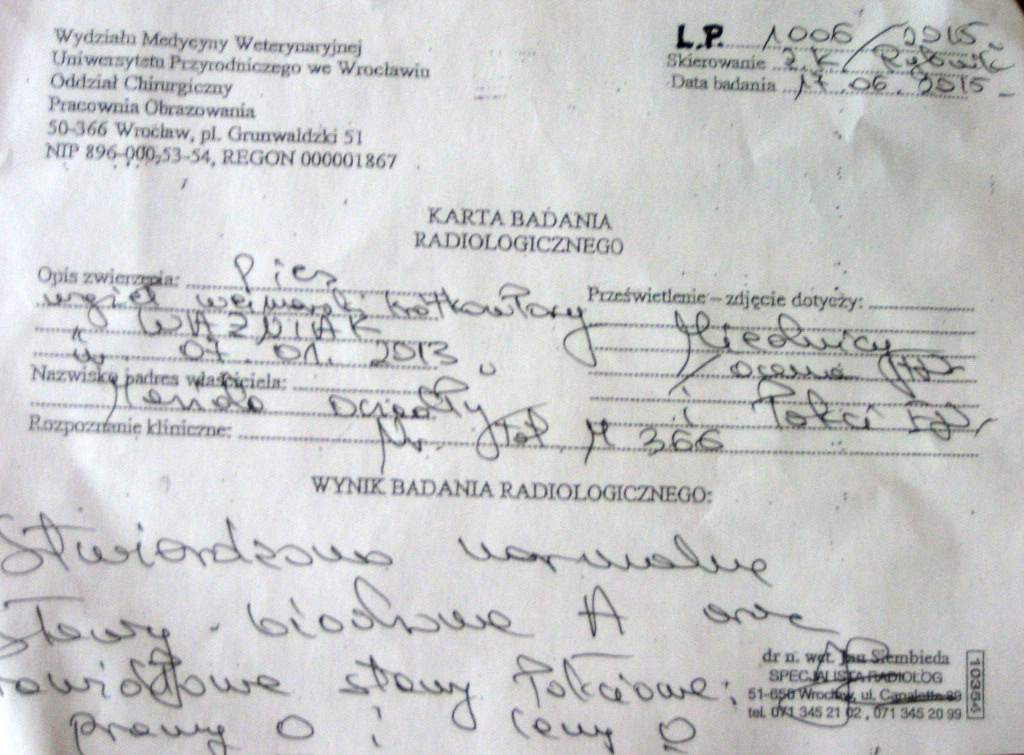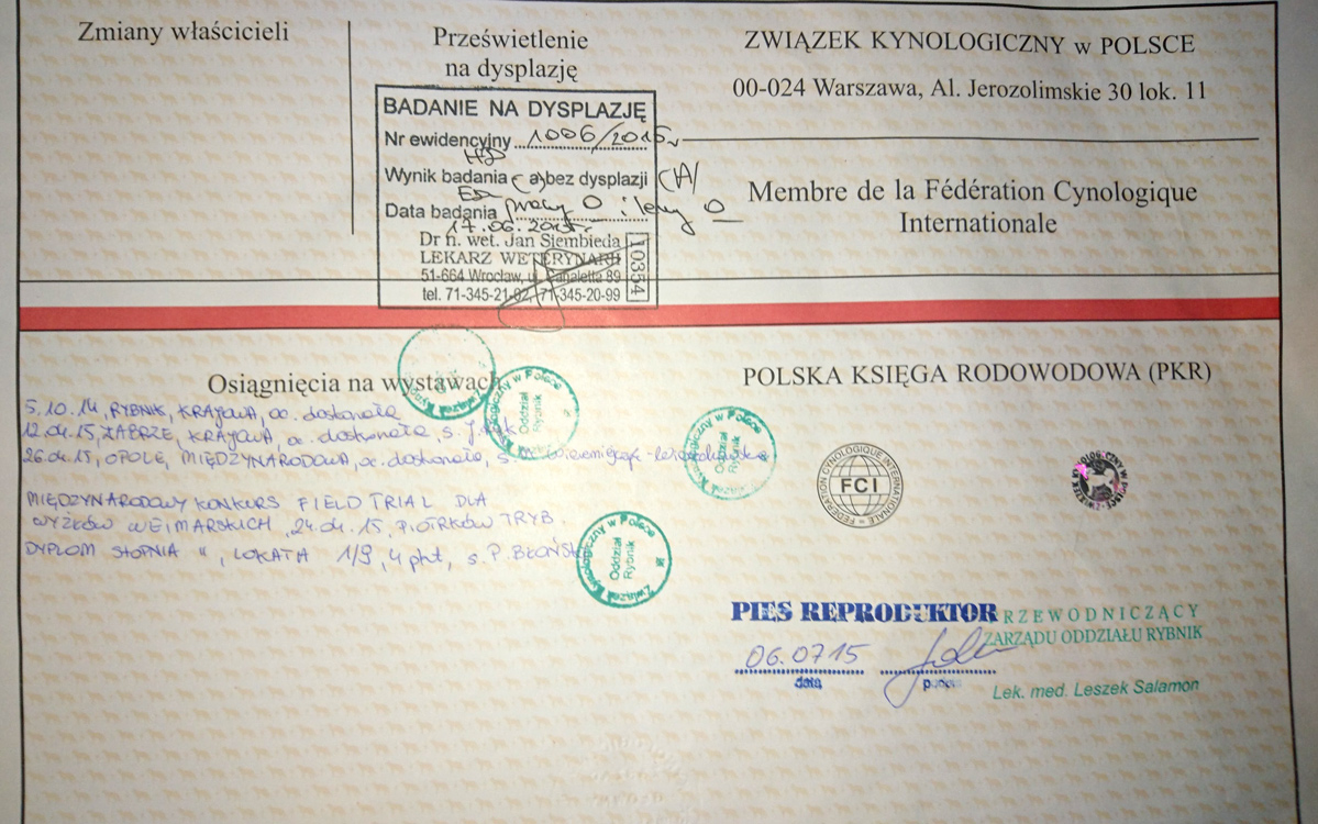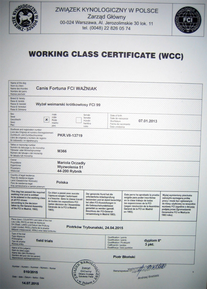 ..."elegancki przedstawiciel rasy z wyraźnym piętnem płci, wyrazista samcza głowa, dobrze noszone i osadzone uszy, elegancka szlachetna szyja, dobre przedpiersie i klatka piersiowa, prawidłowe kątowanie kończyn, dynamiczny w ruchu,doskonała prezentacja "... - Sędzia: Aleksandra Zukal