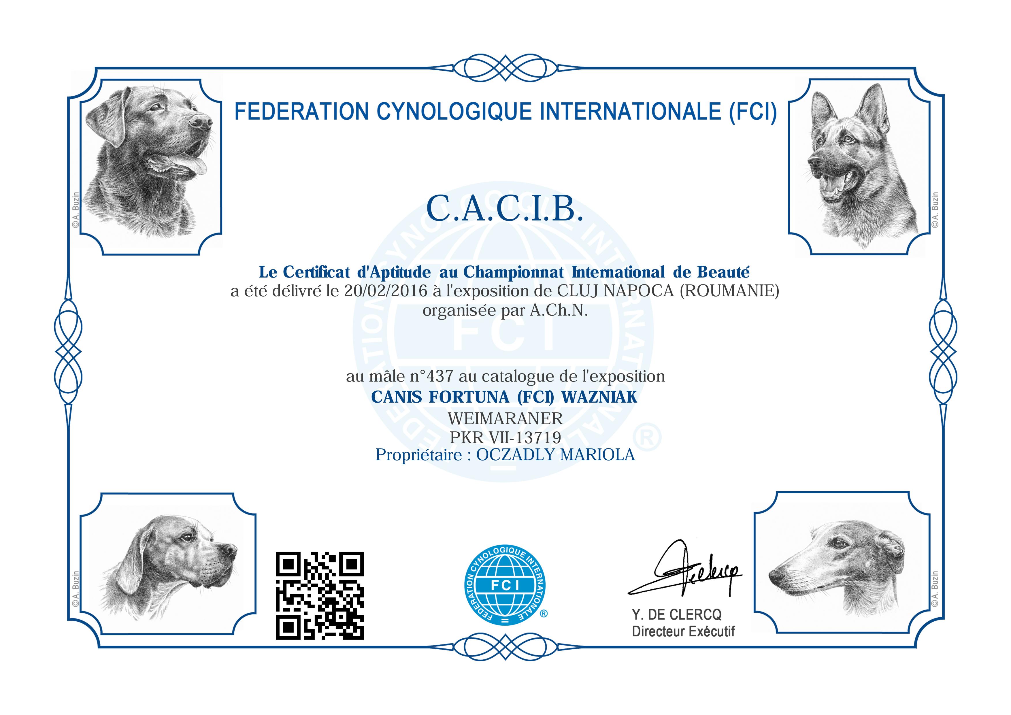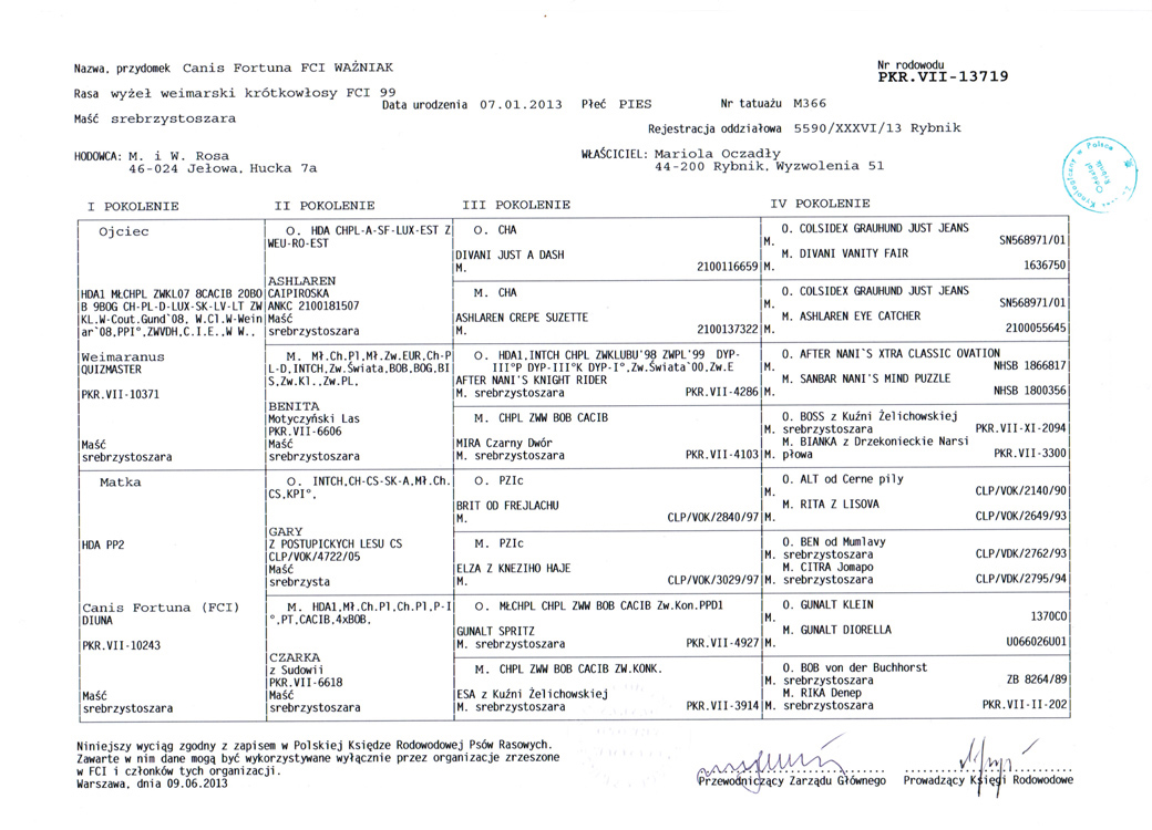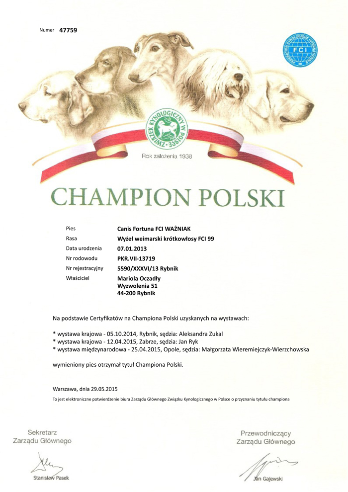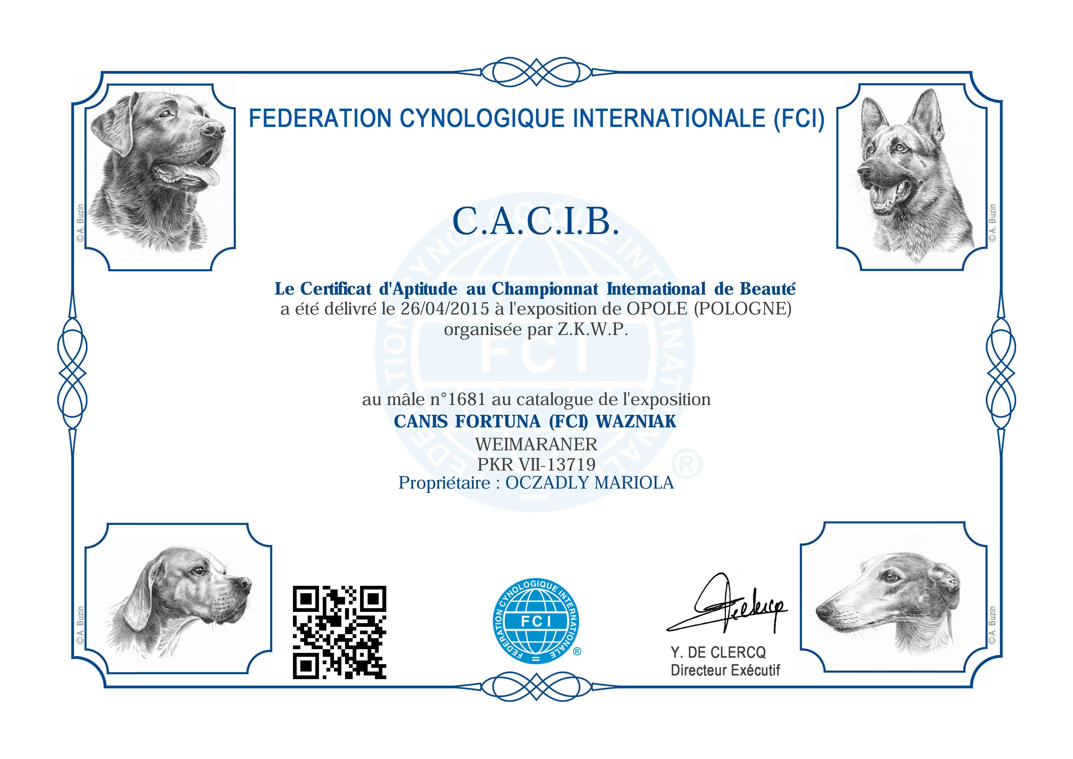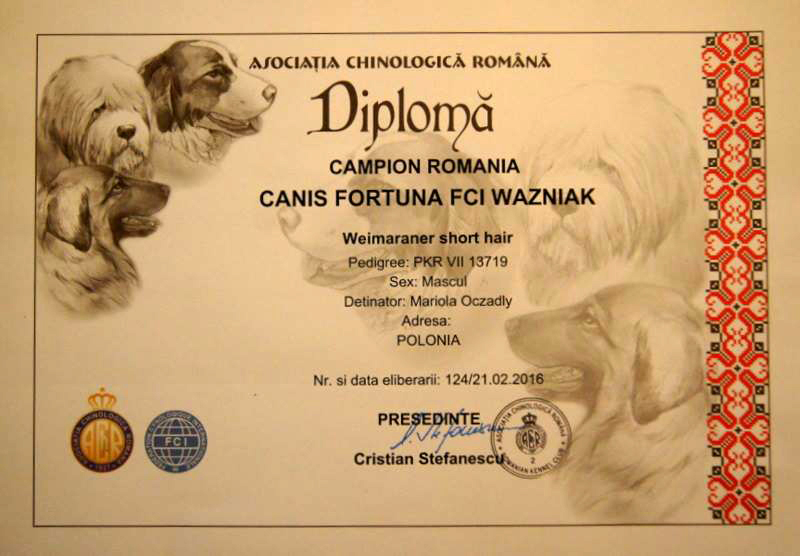..."mocny o pięknych proporcjach pies, doskonała pełna wyrazu głowa, dobre proporcje obu części twarzowej i czaszkowej, długa mocna szyja, wydatne przedpiersie z dobrze zarysowanym mostkiem, głęboka klatka piersiowa, doskonała linia dolna z podkasaniem właściwym rasie, grzbiet prosty, lędźwie umięśnione, ogon noszony poprawnie "... - Sędzia: Tadeusz Chwalny
